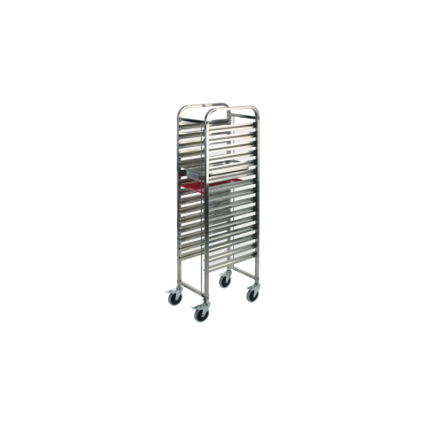 15 dupla támasztósínnel, legfeljebb 30 GN-tálca GN1/2 vagy 15 GN-edény GN1/1 (hosszanti betolás), 75 mm-es rakodási távolsággal, 4 kerekével, ebből 2 fékezhető, 100 kg teherbírással, mindkét oldalán dőlésszabályozóval és átlóghatósággal Magasság: 1735 mm Hossz: 550 mm Szélesség: 385 mm Anyag: Rozsdamentes acél