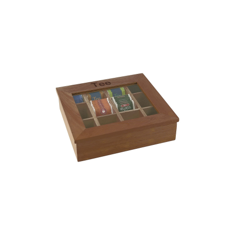 Fából készült doboz átlátszó ablakkal, "Tee" felirattal, 12 rekesszel, amelyek mindegyike 12 egyéni teafiltert tartalmazhat, a fedél nyitva marad Magasság: 90 mm Hossz: 310 mm Szélesség: 280 mm Szín: sötétbarna, világosbarna Anyag: Fa