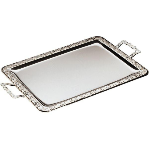 A téglalap alakú APS szervírozó tálca 42x31 cm-es méretű, rozsdamentes acélból készült és króm-nikkel színű. A dekorált tálca alkalmas partikra és ünnepségekre.