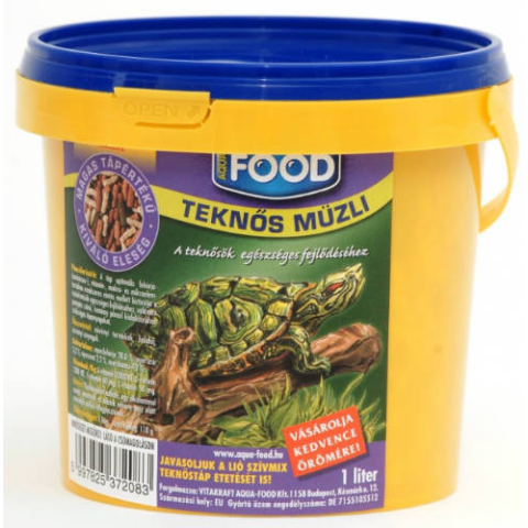 qua-Food Teknős müzli - Víziteknősök részéreKiváló minőségű alapanyagokból készült táp vízi teknősök számára. Fehérjék, zsírok, szénhidrátok mellett létfontosságú vitaminokat is tartalmaz. Teljes értékű táp.Összetétel:Feltárt gabona magvak (kukorica,búza), halliszt, gammarusz liszt, shrimp liszt, halolaj, színezék.Analitikai összetevők:Nyersfehérje: 28%, nyershamu:4,2% ,nyersolajok és zsírok:3,2%, nyersrost:2,2%