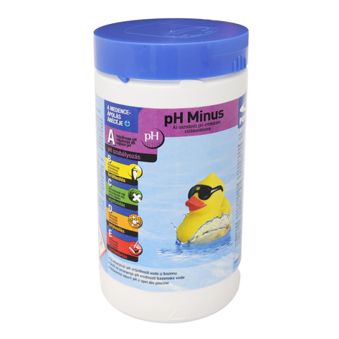 PH-csökkentő, 1,5kg-os por alakú készítmény az uszodavíz pH-értékének csökkentéséhez. Szilárd, kézi adagoláshoz alkalmas. Sokáig eltartható savgranulátum. Hatóanyaga: alkálihidrogénszulfát.