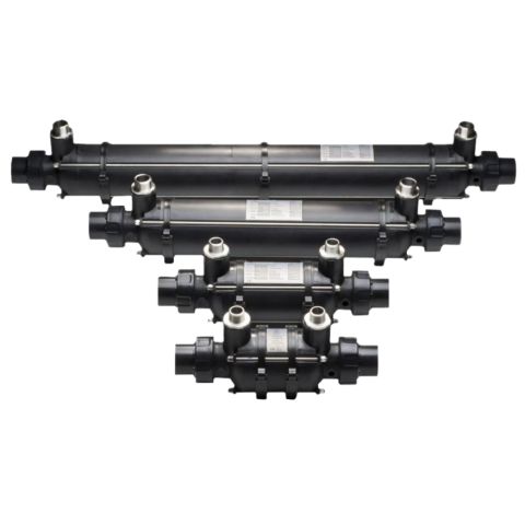 Polipropilén házba szerelt rozsdamentes bordázott (VA típus) vagy titán (Ti típus) csőspirállal, magas korrózió állósággal úszómedencékhez. Sós vizes medencéhez a titán csőregiszteres hőcserélő használható.