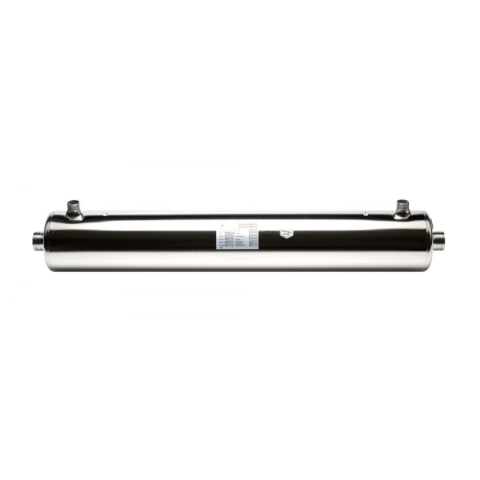 Víz/víz hőcserélő, sima, keresztáramú tekercscsővel, belső héjjal és terelőlemezzel az optimális primerenergia-felvétel érdekében, korszerű hegesztéssel és kiváló minőségű megmunkálással. A készülék hosszú élettartamát az anyag festéssel, passziválással és külső elektropolírozással történő kik