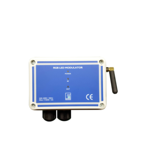 Távirányító. Beépített nyomtatott áramkörrel és kétmagos kábellel rendelkező LED-es lámpákhoz. Lehetővé teszi a felhasználó számára, hogy rádióhullámok segítségével a lámpacsoport programjait a be- és kikapcsolással megváltoztassa anélkül, hogy a gépterembe menne.