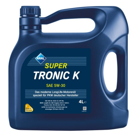 Minősítések és jóváhagyások: ACEA C3, API SN, VW 504 00/507 00, BMW LL-04, MB 229.31/229.51, Porsche C30 Az Aral Super Tronic K 5W-30 egy modern személygépkocsi motorolaj az Aral SzintetikusTechnológiájával. Az alacsony hamutartalmú összetétel a kipufo