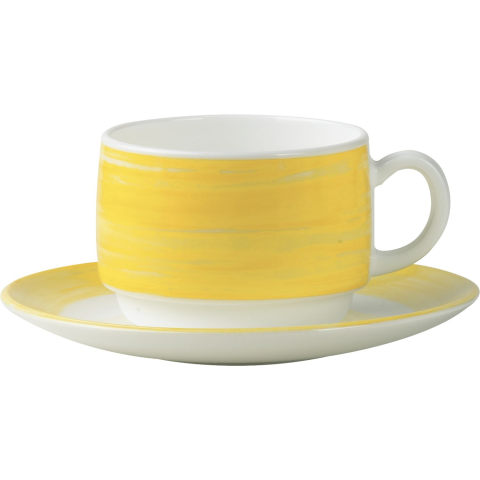 A sárga Arcoroc Brush kávéscsésze, 0,19 l űrtartalommal, opálüvegből készült. A csésze magassága 58 mm, átmérője 78 mm. Alkalmas mindennapi használatra és különleges alkalmakra.