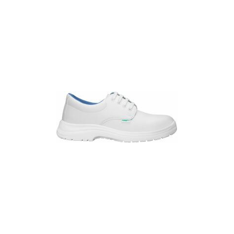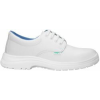 Fehér munkavédelmi félcipő egészségügyi és élelmiszeripari dolgozók számára. Mosható, mikroszálas bevonatú PU bőrből készül, hidrofób felülettel, a talp anyaga poliuretán. A cipő belsejében lélegző anyaggal, amely biztosítja a nedvesség felszívódását. Sza