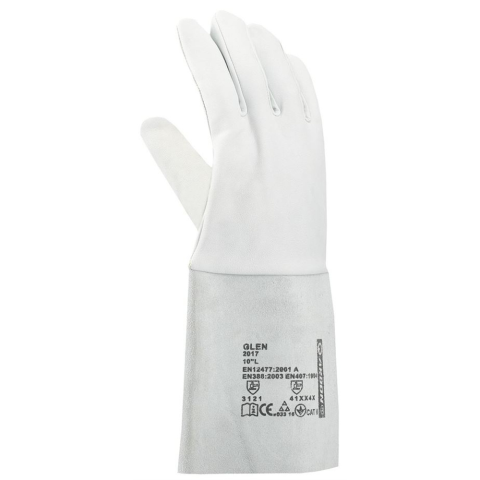 A Glen kombinált bőr hegesztő munkavédelmi kesztyű rendkívül ellenálló a hegesztési feladatok során előforduló sérülésekkel szemben, extra kényelmet biztosít a kéz számára a különböző kézi feladatok elvégzésében. Kecske színbőr tenyér és kézháttal van ellátva, merev hasított marhabőr mandzsetta biztosítja a kézvédelmet.
