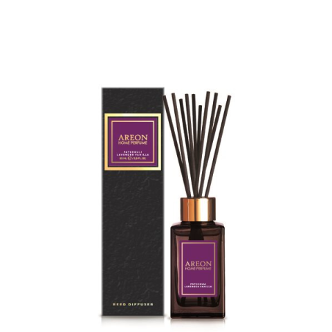 Pálcás aroma diffúzor - virágos, levendula és vanília illat akár 61 nap hatással, 10 pálca, űrtartalma 85 ml Az AREON Home Perfume BLACK Patch-Lavender-Vanilla aroma diffúzor beltéri használatra készült. Egyedi légfrissítő, amely tíz darab speciális porózus fa pálcikával és illatanyaggal töltött üvegfiolával