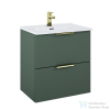 Mosdószekrény és mosdótál szettben. TECHNIKAI LEÍRÁS: - összeszerelt termék - szín: sötétzöld lakkozott, matt kivitel - korpusz és front 16 mm-es farostlemez - lágy záródású fiókok - kerámia mosdó - alumínium fogantyú arany színben - 2 db állítható fém f