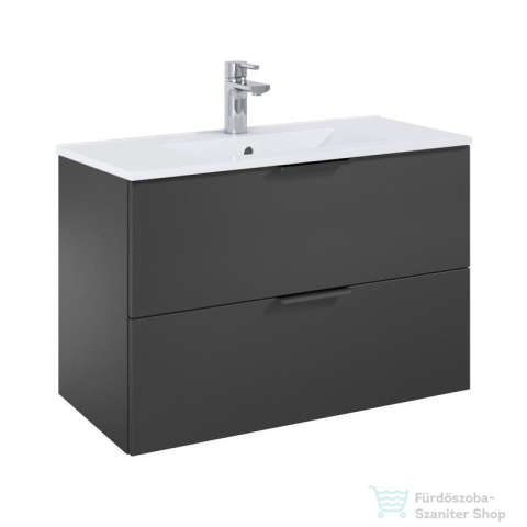 Mosdószekrény és mosdótál szettben. TECHNIKAI LEÍRÁS: - összeszerelt termék - szín: matt antracit - korpusz és front 16 mm-es farostlemez - lágy záródású fiókok - kerámia mosdó - fehér alumínium fogantyú - 2 db állítható fém fali akasztó, összesen 90 kg