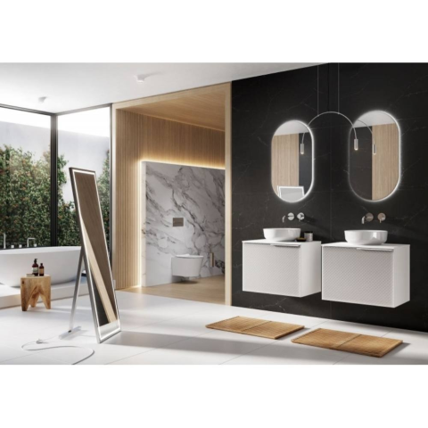 AREZZO design - MALIBU Különleges, mintás üveggel borított előlapja további védelmet nyújt a nedvesség ellen. Praktikus fiók a fiókban kialakítás. Elegáns, minimalista fém fogantyúk. Soft-close fiókfékező, amely garantálja a fiók csendes és elegáns záród