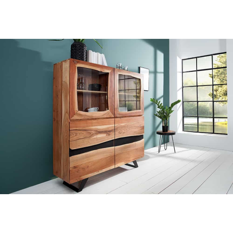 Magas komód Argentinas 140 cm akác Olyan magas komódot keresel, amely bőséges tárolóhelyet kínál és egyedi megjelenésével is kiemelkedik? Ez az impozáns vitrines szekrény tömör akácfából készült és lenyűgöző designjá