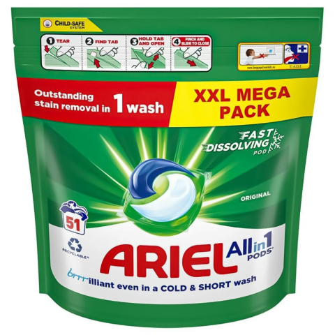 Teljes ARIEL All-in-1 PODS folyékony mosókapszula Original XXL csomag (51db) termékleírás