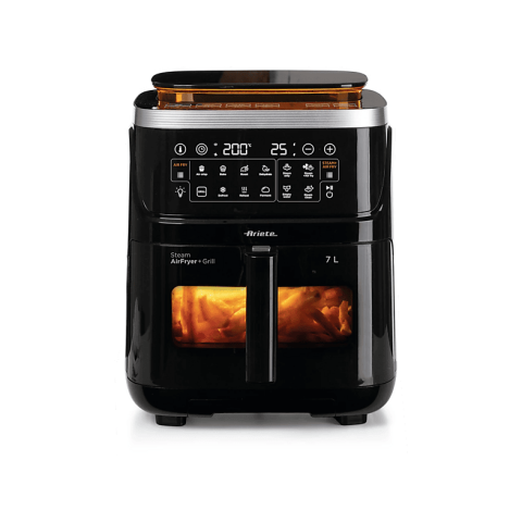 Teljesítmény: 1700 Watt Űrtartalom: 8 liter Digitális érintő kijelző Szabályozható időzítő 10 sütési program Max hőmérséklet: 200 °C Automatikus kikapcsolás, hangjelzéssel Tapadásmentes sütőfelület Könnyen tisztítható Csúszásmentes talp Előnye: Többfunkciós készülék: Air Fryer, Air Fryer + Steam, Steam és Grill. Válassza ki az ideális funkciót: Tiszta gőzfőzés: fix gőzölő 100°C-on, beépített víztartállyal a gőzben való főzéshez, amely lehető