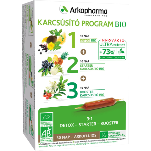 Arkofluids bio karcsúsító program ampulla 30 db 3x10 napos kúra a diéta támogatására. 10 nap méregtelenítés (Arkofluides Detox), 10 nap a karcsúsítás beindítására (Arkofluides Starter (Ananász, édeskömény, mate), 10 nap a tartós karcsúsító hatásért (Ar