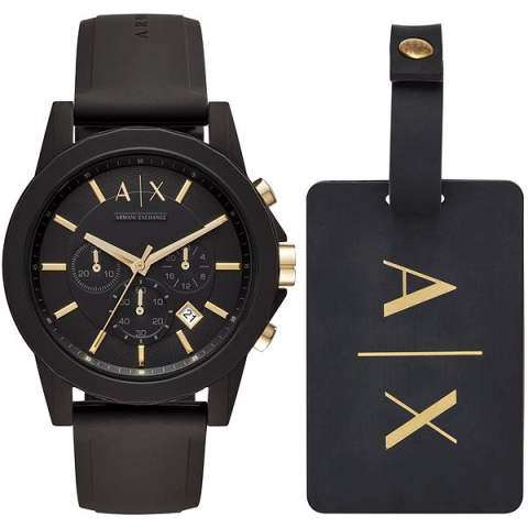Óra ajándékcsomag - férfi, analóg idő megjelenítés, óramű típusa quartz, kerek számlap, 24 órás mód, dátum és kronográf, elegáns, számozás nélküli, ásványi számlap, 50 m (5 ATM) vízhatlanság, tok anyaga acél, tok színe fekete, szíj anyaga szilikon, szíj színe fekete, saját fejlesztésű rögzítés Ha nagyszerű ajándékot keresel férfiaknak, ne keress tovább. Az ARMANI EXCHANGE AX7105 karórák ajándékkészlete minden modern férfinak megfelel. A készlet