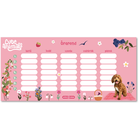 A tanévindítást még vidámabbá varázsolja ez a kedves, kutyás órarend, amelyet kifejezetten az állatokat kedvelő gyerekeknek terveztek. A Cute Animals – Doggie egylapos, kétoldalas órarend rózsaszín hátterével, virágmintáival és egy aranyos, mosolygós kutyus képével nemcsak praktikus, hanem igazi dekorációs darab is a gyerekszobába vagy az iskolai füzetta