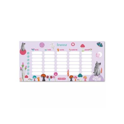 - Kétoldalas órarend A és B hét beosztással - Magyar nyelvű feliratok - 250g félfényes műnyomó papír - Négy szín nyomással - Vidám cica mintával Csomagolás mérete: 0.1 x 10.9 x 23.2 cm
