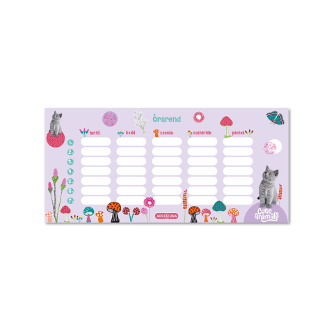 Ismerd meg az Ars Una Cute Animals - Kitten cicás órarendjét, amely a halvány lila alapra nyomott cuki cicás mintájával igazi kedvenc lesz minden cicabarát lány számára. Ez az órarend nemcsak praktikus, hanem stílusos és vidám kiegészítő is a mindennapokhoz.