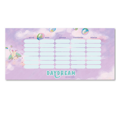 A rózsaszín alapszínű Daydream órarend első sorban a kislányok tetszését fogja elnyerni, és segít nekik abban, hogy az adott napon milyen sorrendben lesznek a tantárgyak, ráadásul a méretét is úgy választották meg, hogy a legtöbb tolltartóban kényelmesen elférjen. A kemény papírból készült órarend tökéletesen alkalmas arra, hogy a tolltartódban emlékeztessen t