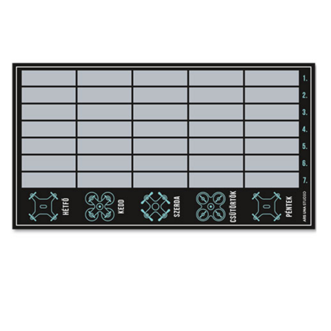 A Drone Racer órarendet a méltán népszerű távirányítós quaderokopterek vagy más néven drónok ihlették, így első sorban a kis srácok tetszését fogja elnyerni, ráadásul a méretét is úgy választották meg, hogy a legtöbb tolltartóban kényelmesen elférjen. A kemény papírból készült órarend tökéletesen alkalmas arra, hogy a tolltartódban emlékeztessen téged