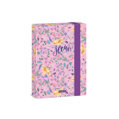 Az Ars Una által gyártott, rózsaszín színű, virág mintás, A5-ös méretű füzetbox a tavaszi szellő frissességét hozza az iskolapadokba. A bájos, rózsaszín alapon elszórtan virító sárga és lila virágok, finom zöld levelek között kalandozva igazi virágos kert benyomását kelti. A kifinomult dizájn elegáns, ívelt "Fleur" felirattal büszkélkedik, ami még inkább kiemeli ezt a bájos, t