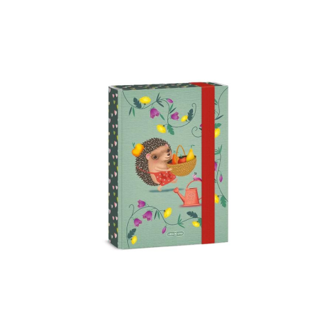 A/5 méretű füzetbox. Kemény, tartós kartonból, 4 cm-es gerinccel, fényes fóliával, 7 mm széles gumipánttal. Belseje egy színnel nyomott. Füzetek, iratok tárolására .