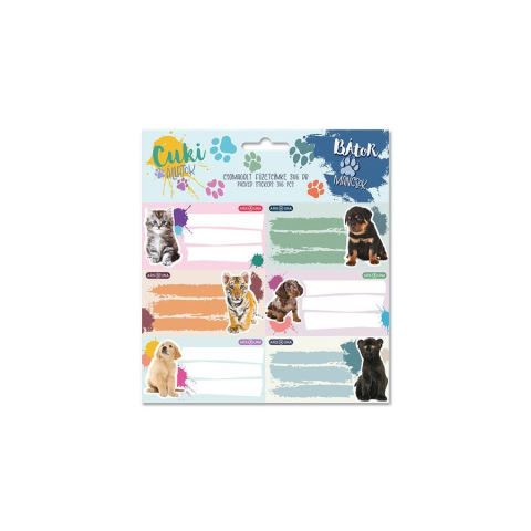 Öntapadós papír füzetcímke, egy csomagban különböző mintákkal. 3 ív x 6 db, összesen 18 db található. Felakasztható fejléccel.