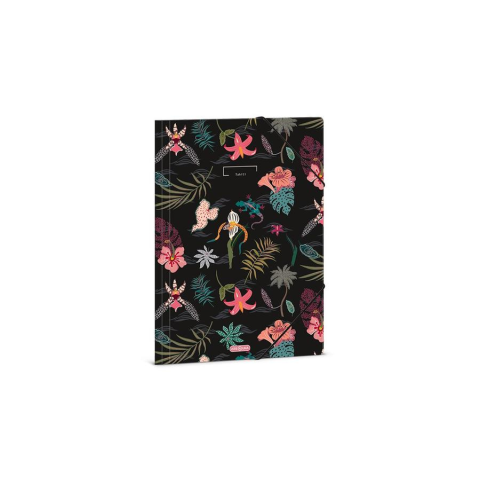A/4 méretű gumis dosszié iratok, füzetek tárolására. 350 gr-os vastag kartonból készült dosszié lekerekített első sarkokkal, színes gumi zárópánttal. Külseje négy színnel, fényes fóliával nyomott. Belső oldala nyomatlan.