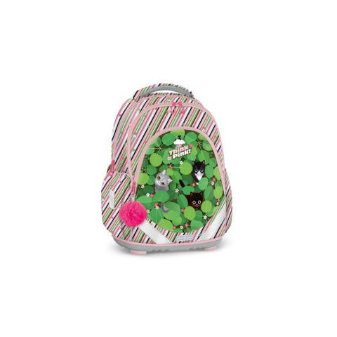 Hátizsák formájú iskolatáska, amely ideális kisiskolásoknak. Ergonómikus kialakítású, szellőztető barázdákkal teli és műanyag merevítésű hátkiképzéssel. Puha, méretre állítható vállpántokkal, amelyekekkel szabályozható, hogy mennyire álljon feszesen a gyerek hátához simulva a táska. A hátizsák három nagy cipzáras rekesszel rendelkezik,az elsőben toll- és igazolvány tartó rekesz található. Oldalán két gumis zsebbel a kulacs részére. Alja tartós é