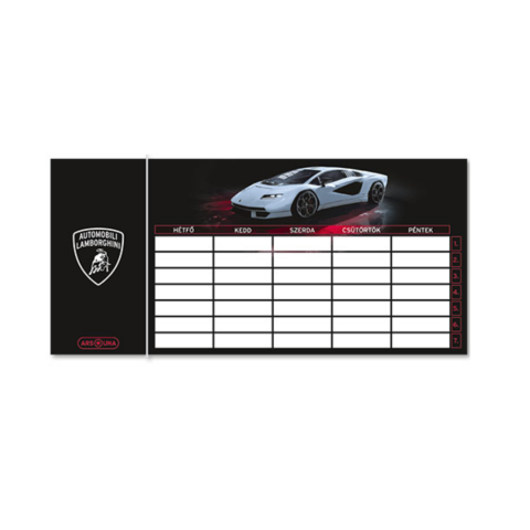 A Lamborghini autós mintázatú órarend első látásra elnyeri a kisfiúk tetszését, akik sokáig felhasználják majd azzal a céllal, hogy megnézzék a napi órarendet és biztosak legyenek abban, hogy nem nem felejtettek ki valamit táskájukból. Az Ars Una órarend egyetlen lapból áll, de két oldalas kialakítást kapott, így A és B hetet is tudsz rajta jelö