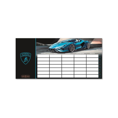 Ismerd meg az Ars Una Lamborghini órarendjét, amely egy igazán stílusos és dinamikus kiegészítő minden autósportot kedvelő diák számára. Ez az órarend fekete alapon kék Lamborghini sportautós mintával van díszítve, valamint az autó logója is kiemelkedik kék színnel, így nemcsak praktikus, hanem inspiráló és izgalmas hangulatot is áraszt, amely motivál minden napod so
