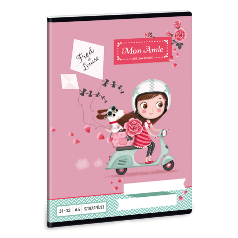 Mon Amie A/5-ös méretű szótárfüzet. 32 lapos, belseje 70 gr-os papírból. Borítója 200 gr-os műnyomó kartonra lekerekített sarkokkal, fényes fóliázással, 4 szín