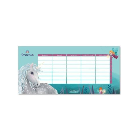 Kétoldalas, magyar nyelvű órarend A és B hét beosztással. 250 gr-os félfényes műnyomó papír. Méret: 10,9 x 23,2 cm