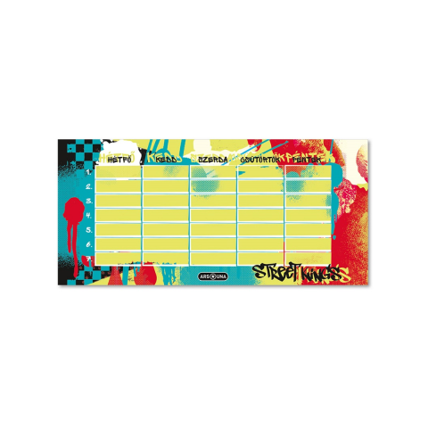 Ismerd meg az Ars Una Street Kings órarendjét, amely egy igazán vagány és stílusos kiegészítő minden street artot kedvelő diák számára. Ez az órarend színes graffiti mintával van díszítve, így nemcsak praktikus, hanem egyedi és energikus megjelenést is kölcsönöz, ami inspirál minden napod során.