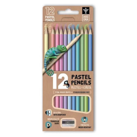 Háromszögletű, pasztell színű, ergonomikus kialakítású színes ceruzakészlet Törésálló ceruzabéllel, TiO2 (titánium-dioxid) mentes ceruzatesttel 12 darabos kiszerelésben, élénk, jól fedő színekben A készlet része egy kiváló minőségű hegyező is A ceruzatest