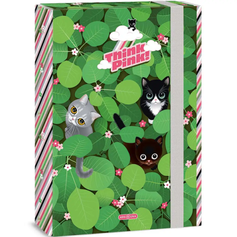 A Think Pink A/4 füzetbox garantáltan mosolyt csal a gyermeked arcára minden nap! Ez a vidám és aranyos dizájn három kíváncsi cicát rejt egy zöld lombtengerben, amit apró rózsaszín virágok és cukorkaszínű csíkos szegély tesz még bájosabbá. A füzetbox a Think Pink sorozat része, így nemcsak praktikus, hanem stílusos és szerethető is – tökéletes választás minden mac