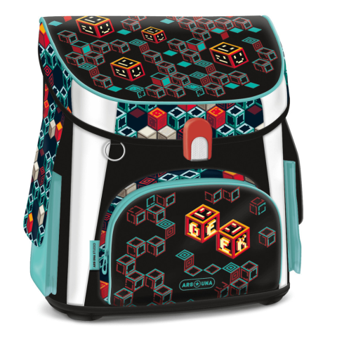 Geek kompakt mágneszáras iskolatáska 41x33x24cm, zöld-fekete Hátizsák formájú iskolatáska. Könnyű súlyú, formatartó szerkezetű, vízlepergető anyagból. Gerinckímélő, vastagon párnázott, merevített, ergonómikus hátkiképzéssel. Puha, méretre állítható vá