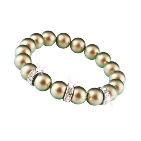 Eredeti Swarovski® gyöngyből készült karkötő, fehér Swarovski® rondella kristályokkal díszítve. A gyöngy zöld árnyalatú. Alkalmi ruhához is hordható, elegáns szín. A karkötő könnyen fel- és levehető, mivel rugalmas fűzőszálra van felfűzve. M-es méret, kb. 18,5cm, ami az általános női méret. A csomag tartalmaz fűzőszálat és egy darab tartalék gyöngyöt. Csomagolás: díszdobozban.