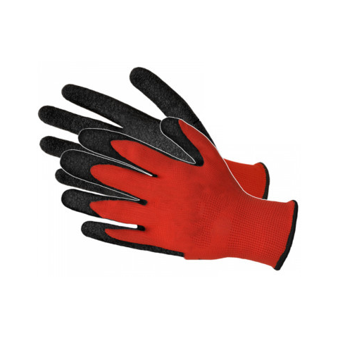 Védőkesztyű kötött varrat nélküli kötött piros színű. latex bevonatú fekete, teljes rugalmas szalag. Tartós, rugalmas, kopás- és szakadásálló. Jól illeszkedik a kezedhez. Az érdesített latex bevonat mobilitást és biztos fogást biztosít a szerszámok s