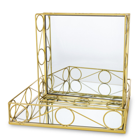A(z) Glamour design aranyszín szögletes 2db-os fém tálca szett tükrös üveglappal 7x34x34 / 7x30x30cm egy stílusos és igényes darab fém, üveg anyagból készült aranysárga színben , mérete: 7x34x34cm . A termék a(z) ART-POL márka kínálatából származik , ered