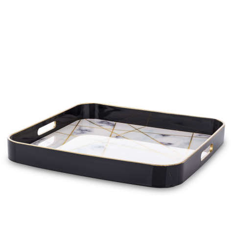 A(z) Tulum design fekete aranyszegélyes íves fogantyús tálca világos márvány jellegű mintával 4,5x34x34cm egy stílusos és igényes darab műanyag anyagból készült fekete, fehér, arany színben , mérete: 4,5x34x34cm . A termék a(z) ART-POL márka kínálatából s