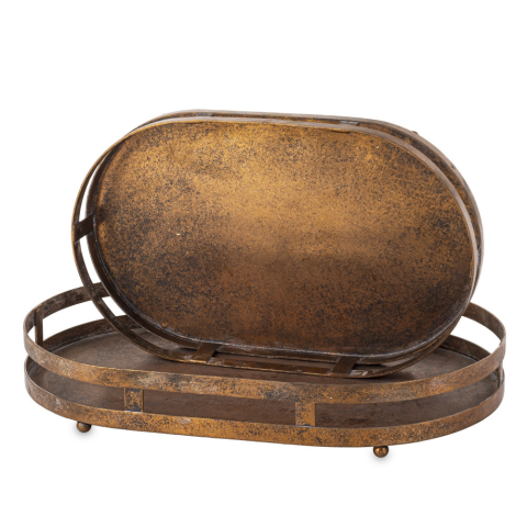 A(z) Ovális fogantyús koptatott bronz színű 2db-os fém tálca szett 6x40x26/6x35x22cm egy stílusos és igényes darab fém anyagból készült aranysárga színben , mérete: 6x40x26cm . A termék a(z) ART-POL márka kínálatából származik , eredeti származási helye: