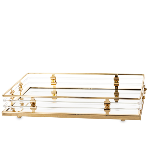 A(z) Glamour design kecses szögletes sárgaarany fém tálca lábakon üvegfelülettel és díszítéssel 6x36x23cm egy stílusos és igényes darab fém, üveg anyagból készült arany, víztiszta színben , mérete: 6x36x23cm . A termék a(z) ART-POL márka kínálatából szárm