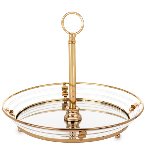 A(z) Glamour design kecses kerek sárgaarany fém kínálótálca lábakon üvegfelülettel és fogantyúval 32x26x26cm egy stílusos és igényes darab fém, üveg anyagból készült arany, víztiszta színben , mérete: 32x26x26cm . A termék a(z) ART-POL márka kínálatából s