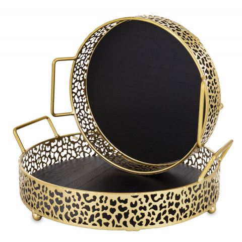 A(z) Glamour design aranyszín kerek 2db-os fém tálca szett barna fa tálcalappal 10x32,5x30 / 10x27x25cm egy stílusos és igényes darab fém, fa anyagból készült arany, fekete színben , mérete: 10x32,5x30cm . A termék a(z) ART-POL márka kínálatából származik