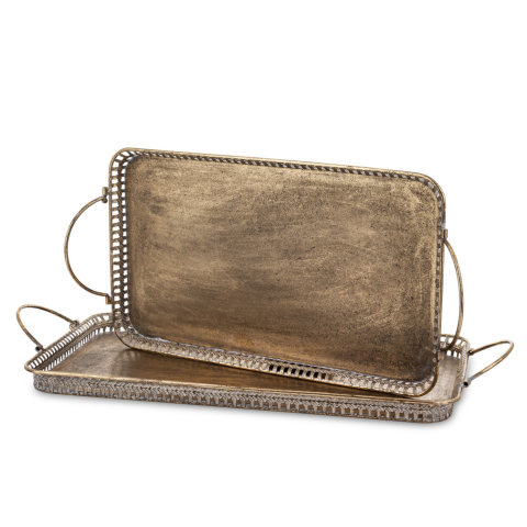 A(z) Antik szögletes bronzos 2db-os tálca szett 7x61x32,5 / 7x55x27cm egy stílusos és igényes darab fém anyagból készült arany színben , mérete: 7x61x32,5cm . A termék a(z) ART-POL márka kínálatából származik , eredeti származási helye: Lengyelország.
