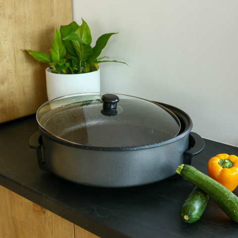 A multifunkcionális elektromos serpenyő ideális pizza, gyros, palacsinta, paella, steak, kolbász, hal, kuszkusz és még sok más étel elkészítésére. A készülék 5 melegségi fokozattal, illetve egy melegen tartó funkcióval rendelkezik.Pizzasütőként is használható. Nemcsak a kész, a fagyasztott pizzák, hanem a nyers tésztából készültek is elkészülhetnek benne.Alkalmas grillezésre, párolásra, sütésre, főzésre.Tulajdonságok:- átmérő:40 cm-mélység: 9cm-tapad