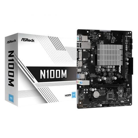Integrált CPU, Intel Quad-Core N100, 1xDDR4, Max:3200MHz, Max:16GB, 1xPCIE16, 1xPCIE1, 2xSATA3, 4xUSB, 2xUSB3.2, 1xUSB3.2C, VGA, HDMI, DisplayPort, PS2:1 db, 7.1, Gigabit, 1xM.2, Micro-ATX